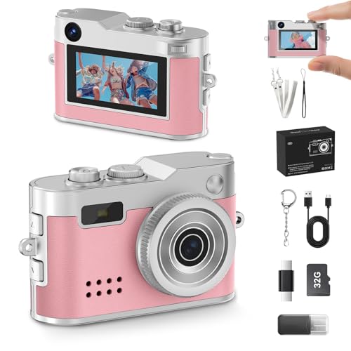 Digital Camera, Kids Camera with 32GB Card, FHD 1080P 44MP Vlogging Camera, 16X Zoom Point and Shoot Digital Camera Compact Portable Rechargeable Cameras for Teens Boys Girls Students Seniors-Pink