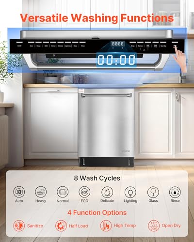 Multi-Function Design: This dishwashing machine features a touch panel with 8 wash cycles (Auto, Heavy, Normal, ECO, Delicate, Lighting, Glass, Rinse) and 4 optional functions (Sanitize, Half Load, High Temp, Open Dry) to cover all your dishwashing needs