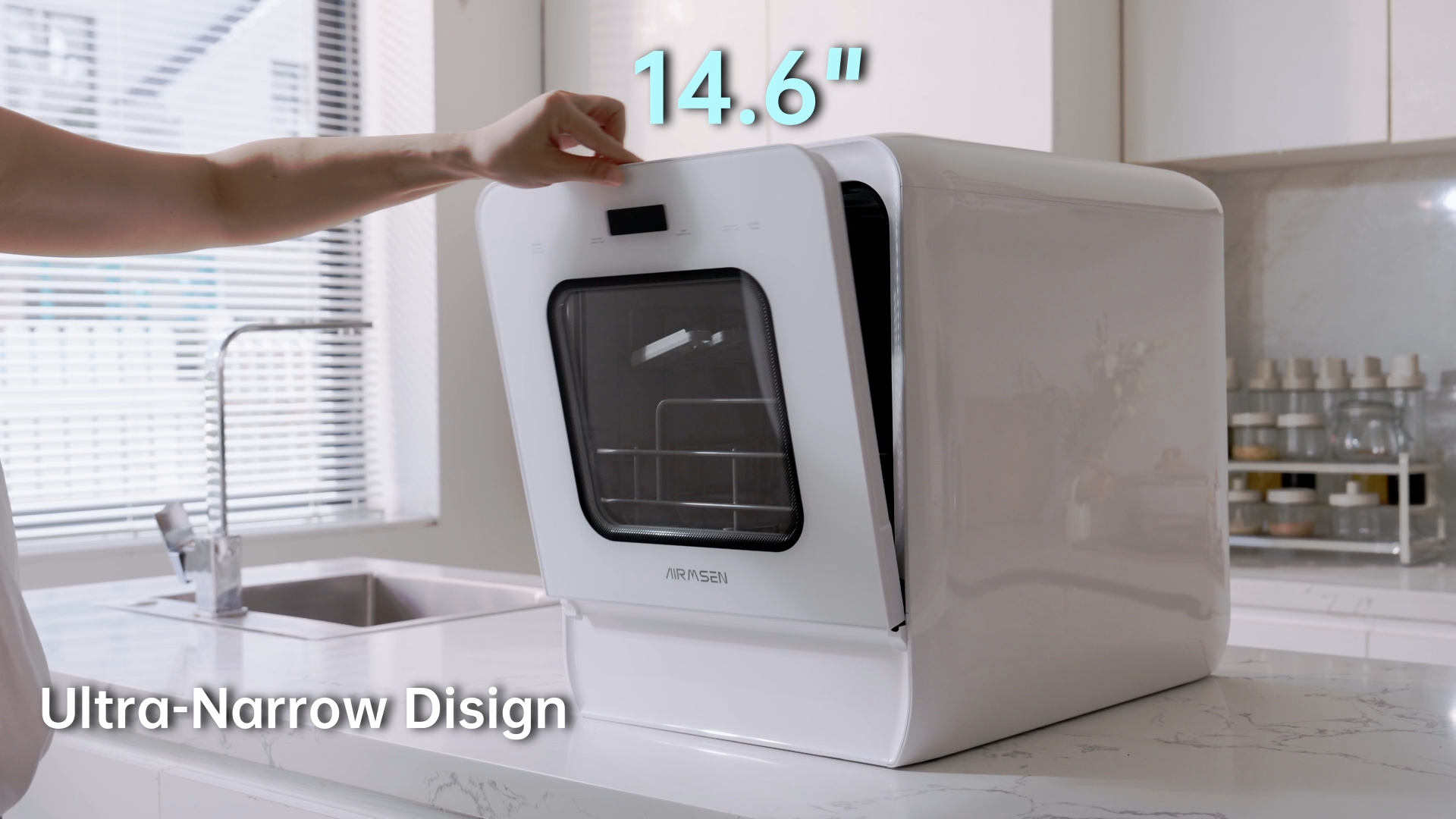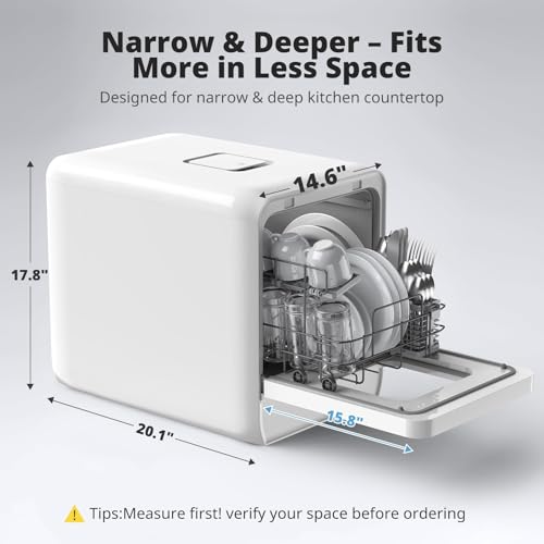 ULTRA-NARROW DESIGN : The compact C01 dishwasher, at just 14.6” wide, saves 20% kitchen space compared to standard 16.75” models, helping small kitchens feel less cramped. Its optimized interior fits 4 place settings like a 17” counter top dishwasher, making multiple washes a thing of the past.
