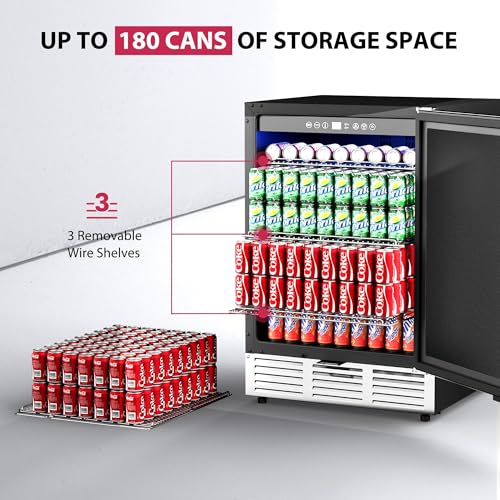 EXTRA LARGE CAPACITY – 24 inch beverage refrigerator beverage cooler, holds 180 cans of beverages. You can refrigerate different sizes of soda, beer, and wine. Meanwhile, 3 removable shelves allow for height adjustments to make the space fit your different-sized beverages, helping you better plan your refrigeratoroutdoor refrigerator storage space.