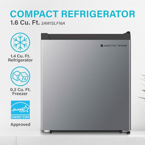 Bring all the convenience of chilled goods to small spaces with a compact refrigerator from Arctic Wind, an appliance specifically designed for your space saving needs. This 1.6-cu. ft. model features a dedicated freezer compartment to ensure your frozen treats are kept as cold as you like them until you’re ready to enjoy. A 2-liter bottle rack adds easy grab-and-go capability to the refrigerator door while glass shelf completes the refrigerator compartment to optimize storage. This unit is ideal for dorm rooms, mini bars, offices, and garages when you need a quick drink or snack at your fingertips. The reversible door and adjustable legs make sure the fridge fits where you need it whether it’s under a desk, on a countertop, or in the corner of the room. An adjustable temperature control allows you to choose your desired coldness. A 1 year warranty is also included so you’ll have peace of mind while storing your snacks and lunches. Improve your life with the easy accessibility of a compact refrigerator from Arctic Wind.