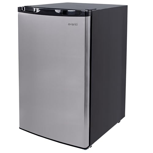 The Avanti AVARM4436SS refrigerator is black and counter-high, has a stainless steel door and a full-width freezer compartment, and is suitable for storing food and keeping it cold. The glass shelves can be adjusted to different heights to accommodate the refrigerator’s contents. The door has two half-width storage bins, one full-width bin that accepts gallon-size jugs, and a dispenser that holds up to six beverage cans. The door can be installed to open from either the left or right side. The recessed handle facilitates opening and closing. A light illuminates the refrigerator’s interior. The thermostat can be used to adjust the refrigerator’s temperature and has a button for defrosting. Adjustable leveling legs enable the refrigerator to be leveled on sloped or uneven surfaces. The back of the refrigerator is flat to conserve space. The refrigerator has a 4.4 cu. ft. capacity, weighs 52 lb., and measures 33 x 19.25 x 22 inches (H x W x L). (H is height, the vertical distance from lowest to highest point; W is width, the horizontal distance from left to right; L is length, the horizontal distance from front to back.) It contains R600A refrigerant and is Energy Star certified for energy efficiency. The refrigerator is rated for 110V.