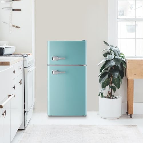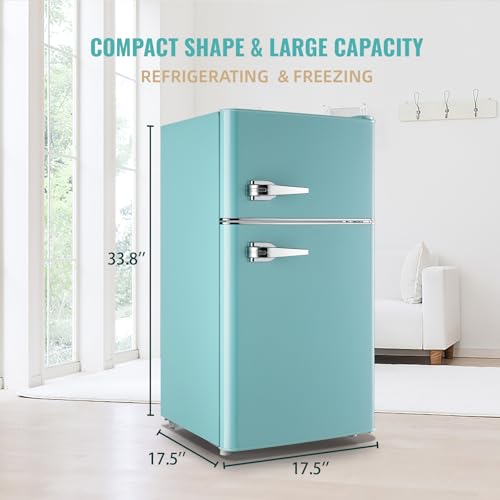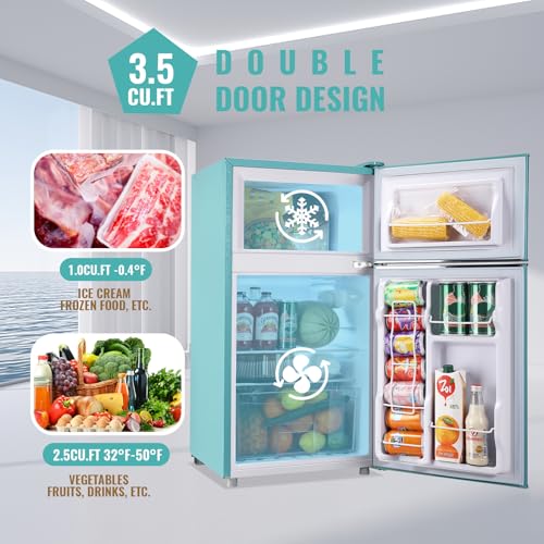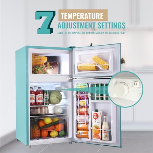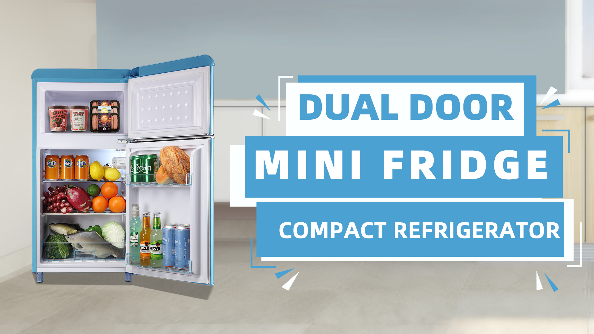 DUAL DOOR RETRO DESIGN: This refrigerator has a double door design to keep your food in order. The large internal capacity divides the refrigerator into refrigeration area and freezing area, which is more spacious than the ordinary mini refrigerator