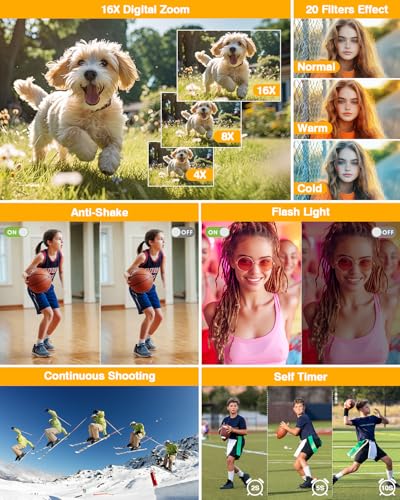 【16X Digital Zoom & Multi-function Camera】—- This point and shoot camera features 16x digital zoom function, You can press the W/T button to zoom in or zoom out the subject, obtain high quality image, and additional features like self timer (3S/5S/10S), 3-continuous shooting, flash light, Anti-shake function etc, it is great small camera for beginners use.