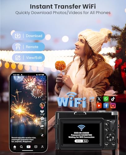 📱 [Instant WiFi Sharing & App Control] With built-in WiFi, you can instantly transfer photos and videos from the upgraded photography camera to your smartphone(can be used by all Phones). Edit and share directly to YouTube, TikTok, or Instagram—no cables required. The 4K vlogging camera for YouTube also functions as a webcam, making it perfect for live streaming and video chatting. Even better, the WiFi digital camera supports timed shooting via phone control for selfies.