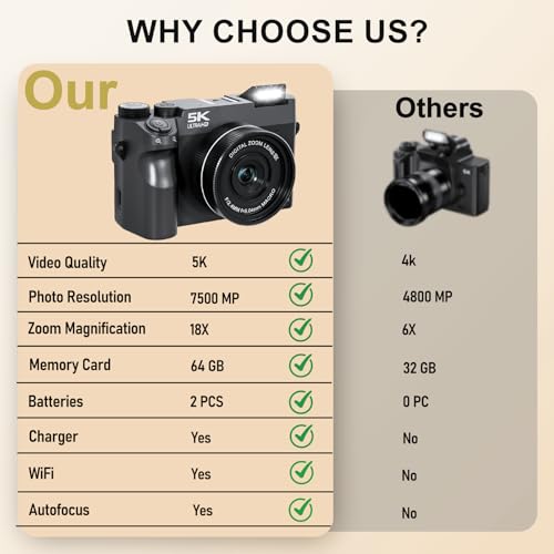 5K & 75MP PROFESSIONAL IMAGE QUALITY: 5K Digital camera ultra-high definition video provides cinematic detail for YouTube and TikTok content. Equipped with an advanced CMOS sensor, Cameras for photography can capture high-resolution photos of up to 75 megapixels. Combined Auto Focus, it quickly locks onto moving subjects, ensuring every moment is sharp and clear. (Adjustable resolution: 20MP – 75MP)
