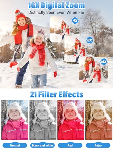 【Portable Travel & Multi-Functional】This kid-friendly camera is perfect for everyday use and on-the-go adventures, thanks to its compact, durable, and lightweight design that fits easily in a pocket. It’s also packed with creative features like anti-shake, 16x zoom, time-lapse, slow motion, continuous shooting, as well as adjustable white balance, ISO, metering, and fun filters.