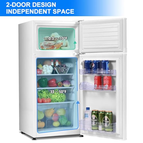 2 Door Dual Zone Design, double door design, the frozen section is suitable for seafood, ice and cream meat. The refrigerator section is suitable for storing fruits and vegetables and egg drinks. The door provides a location for your favorite canned beverage.